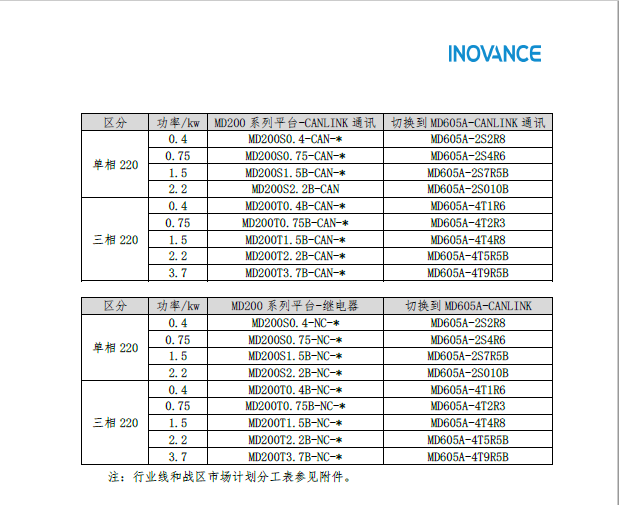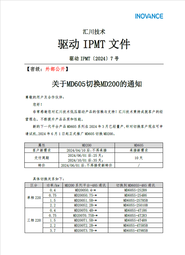 關(guān)于匯川變頻器MD605全面切換MD200情況說明